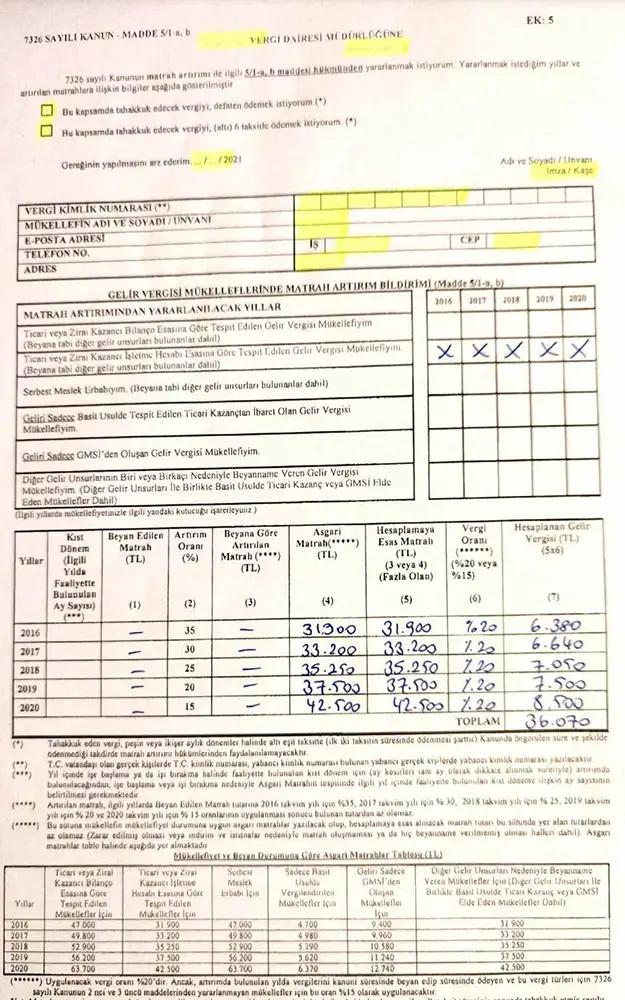 Ardından; * Vergi kimlik numarası; size verilen 996 ile başlayan 10 haneli koddur. Bunu formdaki kutucuklara tek tek girin. * Kişi ve iletişim bilgilerini eksiksiz bir şekilde doldurun. * Matrah artırım bildirimi kısmını ise yukarıdaki görseldeki gibi doldurun.
