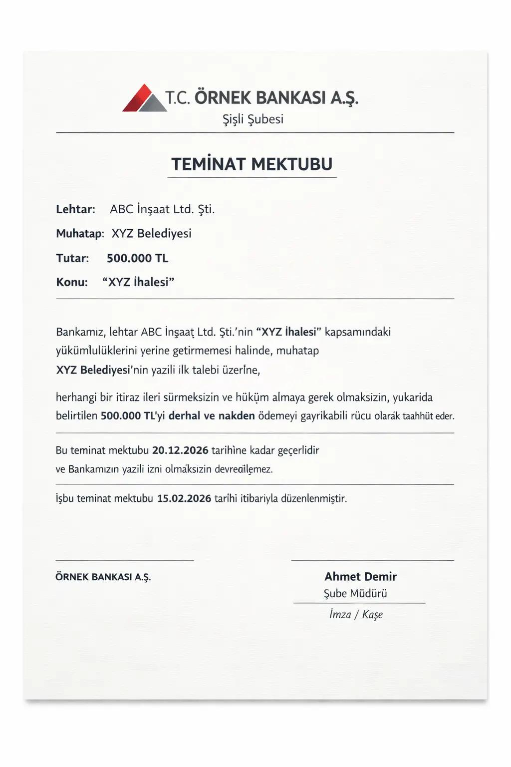 Teminat mektubu örnekleri genellikle bankalar tarafından standart metinler üzerinden hazırlanır. Ancak teminat tutarı, muhatap bilgileri ve süre gibi alanlar; ilgili sözleşme veya ihale şartlarına göre düzenlenir. Bu nedenle, teminat mektubu hazırlanırken ihale veya sözleşme metnindeki şartların banka ile uyumlu olması önemlidir.