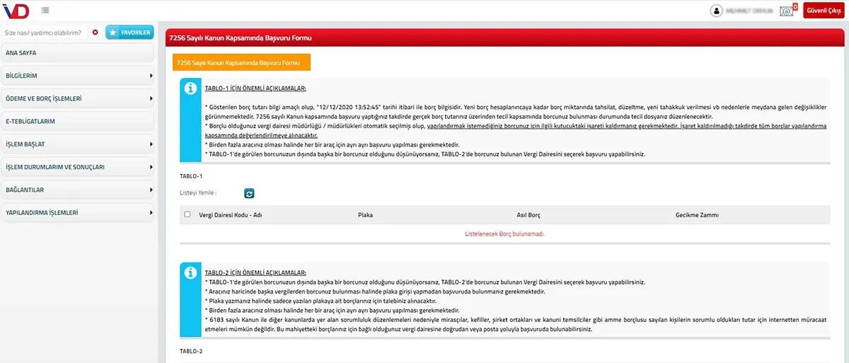 Başvurunuz vergi dairenizce değerlendirildikten sonra ödeme planınızı, “7256 Yapılandırma Kanunu Kapsamında Tecil İşlemleri” menüsü altında yer alan “7256 Başvurularım” alanından görüntüleyebilirsiniz.