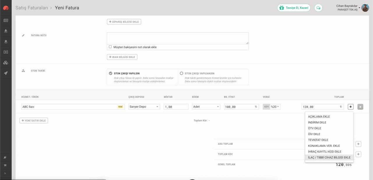 Satış faturası oluşturma ekranında İlacınızı veya Tıbbi cihazınızı ürün/hizmetini fatura kalemine ekleyin. İlgili fatura kalemi yanında bulunan “+” butonuna tıklayarak açılan menüde “İlaç/Tıbbi Cihaz Bilgisi Ekle” butonuna tıklayın.