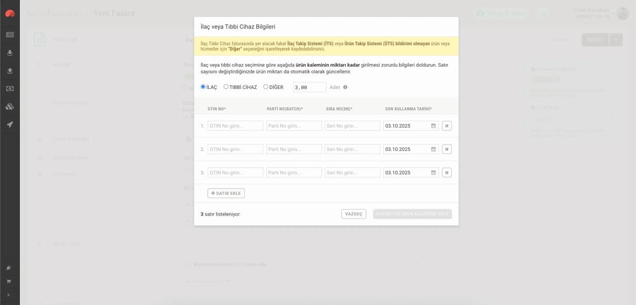 İlaç ve Tıbbi cihaz bilgisi bulunan kalemlerin miktarları artık fatura kalemi içerisinden değil, İlaç ve Tıbbi cihaz modalı içerisinden düzenlenebilir. Sizlerin yanlışlıkla adeti değiştirerek kayıtlı verileri silmemeniz için bu şekilde bir düzenleme yapıldı. Eğer İlaç ve Tıbbi Cihaz bilgisini fatura kaleminden kaldırırsanız yeniden kalem miktarını fatura içinden düzenleyebilirsiniz.