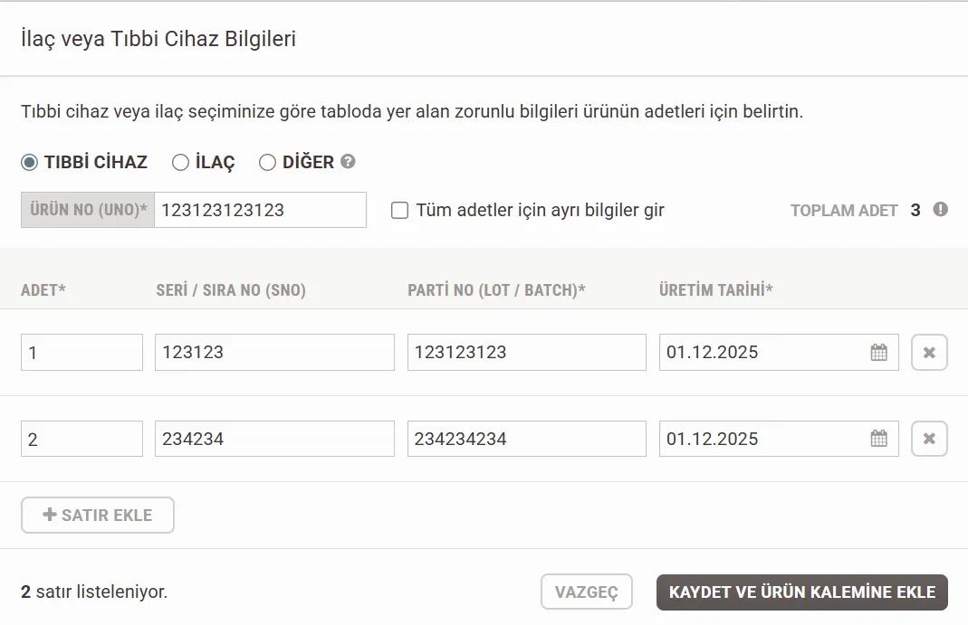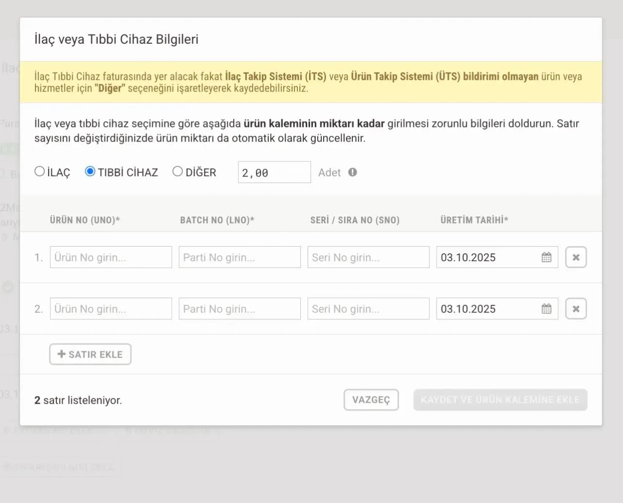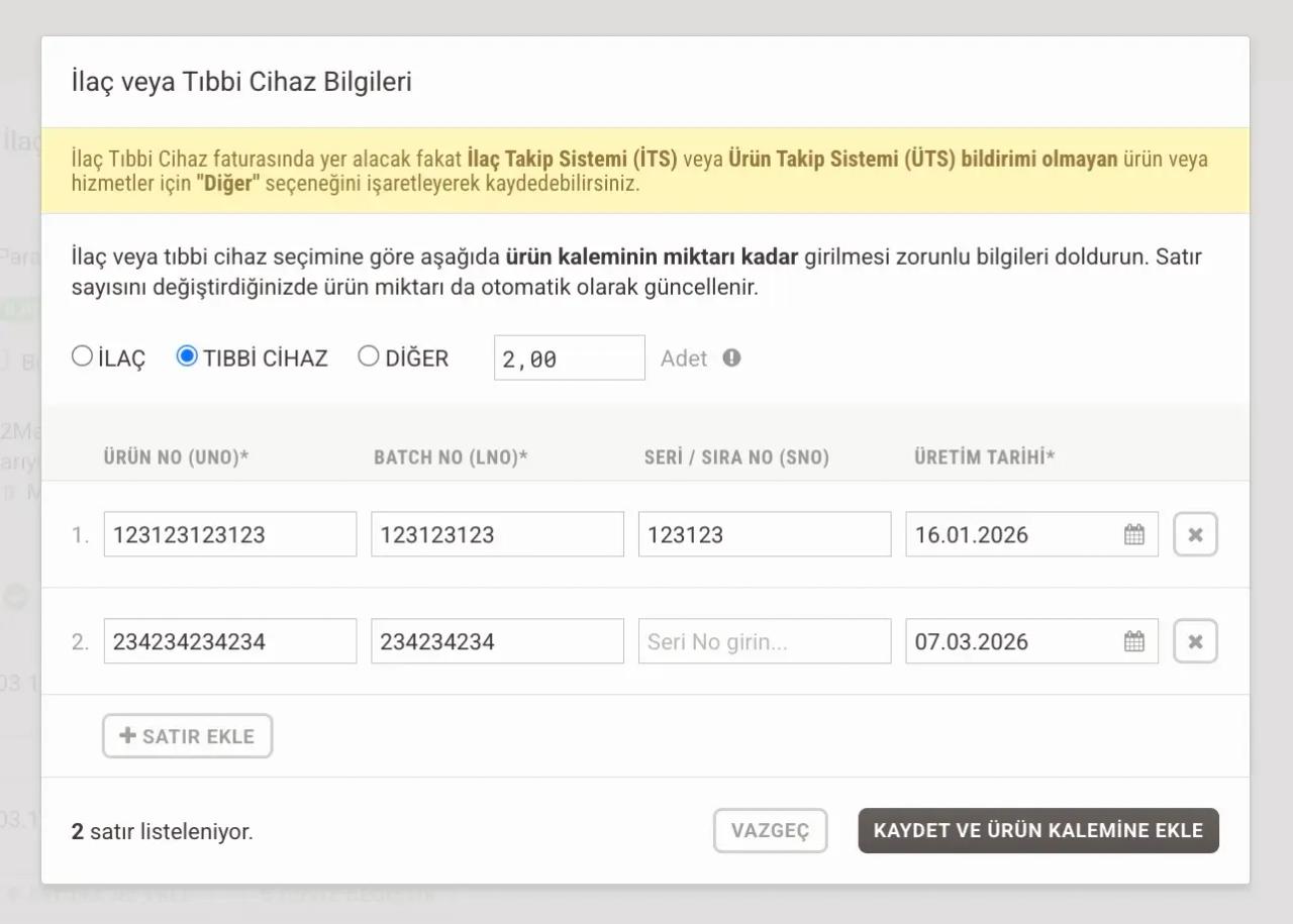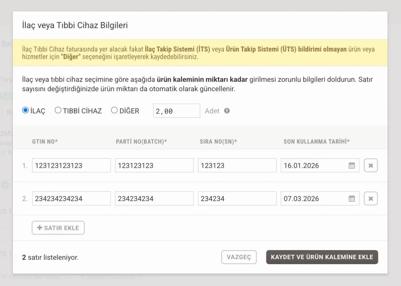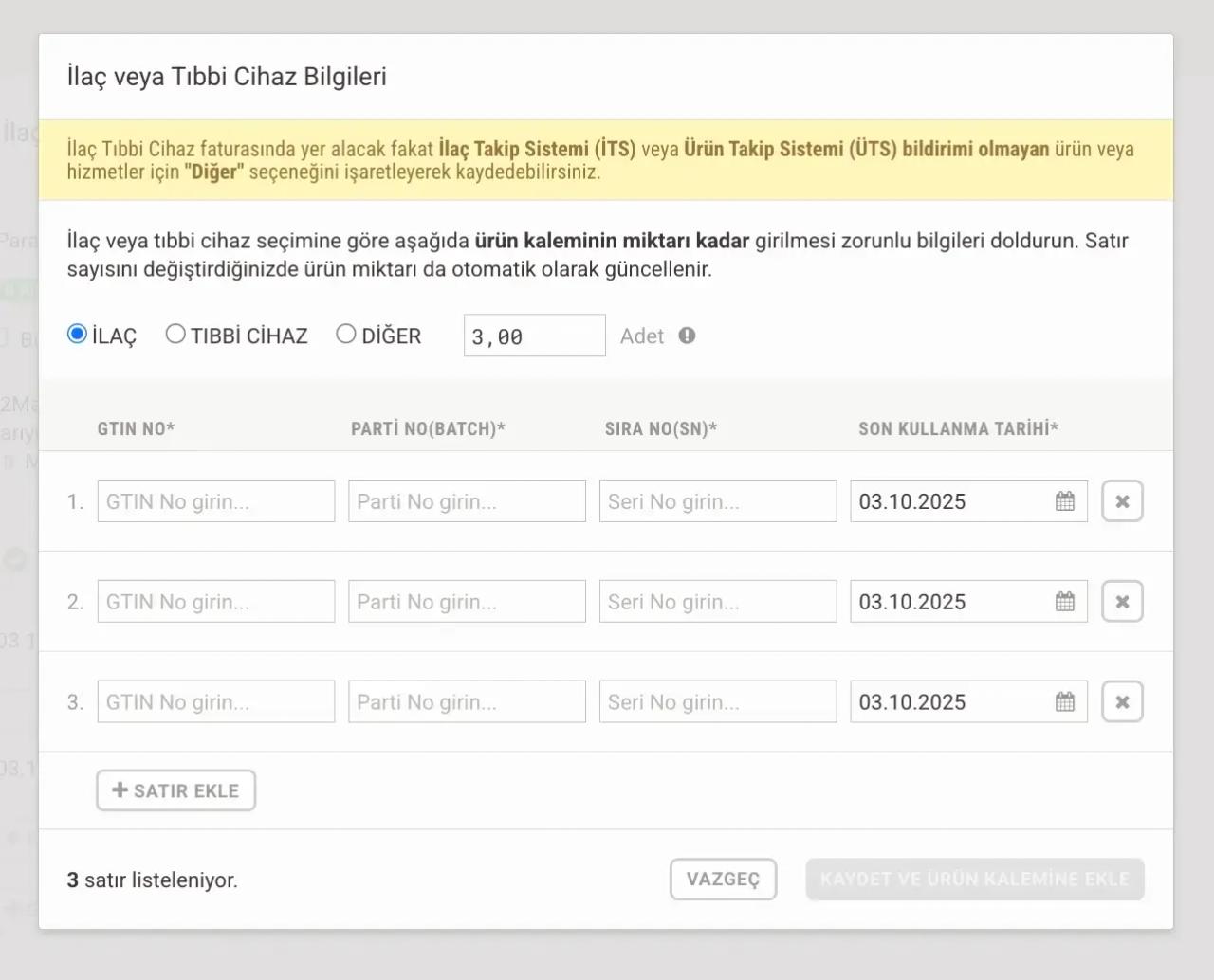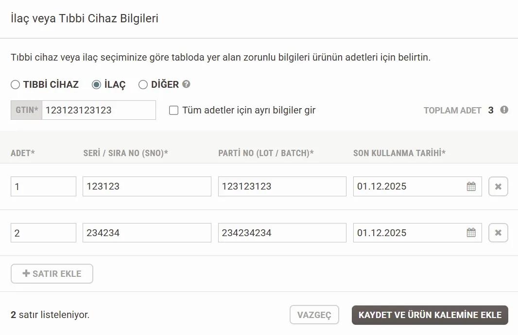 Ürün/hizmet kalemindeki miktar kadar ilaç veya tıbbi cihaz bilgisi girilmesi zorunludur.