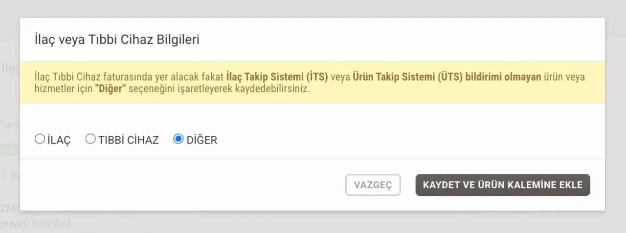 Açılan pencerede; İlaç veya Tıbbi Cihaz bilgisi seçilmelidir. Faturadaki bir ürün/hizmet kalemine sadece İlaç, sadece Tıbbi Cihaz veya sadece Diğer bilgisi eklenebilir fakat fatura içerisinde birden fazla ürün kaleminde İlaç bilgisi, Tıbbi Cihaz bilgisi veya Diğer bilgisi eklenebilmektedir.