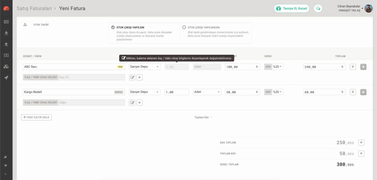 İlaç ve Tıbbi cihaz bilgisi bulunan faturalarda GIB’in yayınladığı kuralları gereği ürün/hizmet kalemi miktarı tam sayı olmak zorundadır, eğer ondalıklı sayı girilirse Paraşüt en yakın tam sayıya yuvarlama yapacaktır. Ek olarak 0 ile 1 arasında bir değer alamaz.