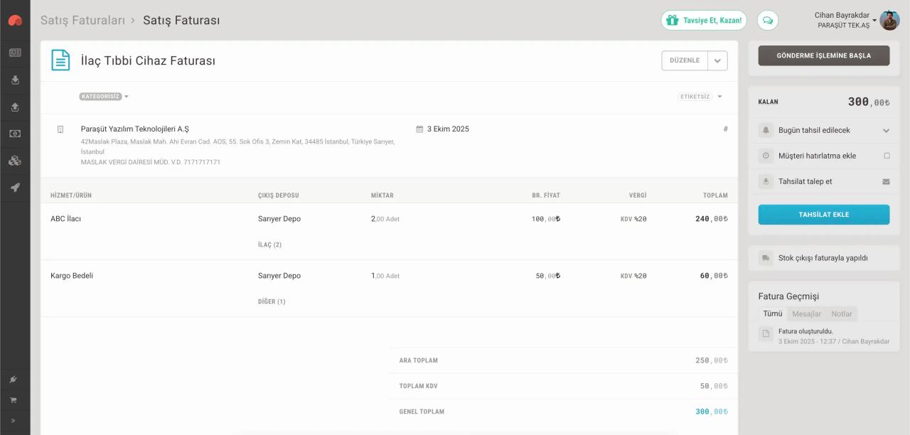 Bu işlemi tamamladıktan sonra faturayı kaydedip gönderme işlemine başlayabilirsiniz. İlaç ve Tıbbi Cihaz faturanızı bu şekilde resmileştirebilirsiniz.