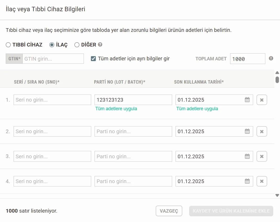 “Tüm adetler için ayrı bilgiler gir” kutucuğunu işaretlediğinizde, toplam adedi tek seferde belirleyebilirsiniz. Ayrıca parti numarası ve son kullanma tarihini tüm adetlere uygulama seçenekleri de bu ekranda yer alır.