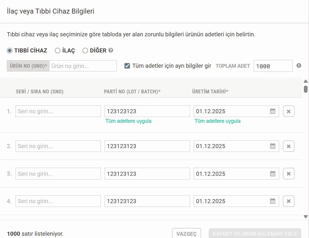 Örneğin: İlgili ürün kaleminin miktarı 4 adet ise 4 ilaç ve tıbbi cihaz bilgisi satırı oluşmaktadır ve bu alanların dördü de doldurulmalıdır.
