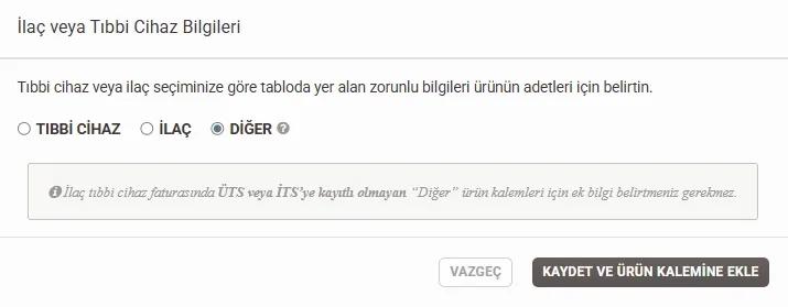 İlgili alandan İlaç veya Tıbbi Cihaz bilgisi seçilmelidir. Faturadaki bir ürün/hizmet kalemine sadece İlaç, sadece Tıbbi Cihaz veya sadece Diğer bilgisi eklenebilir fakat fatura içerisinde birden fazla ürün kaleminde İlaç bilgisi, Tıbbi Cihaz bilgisi veya Diğer bilgisi eklenebilmektedir.