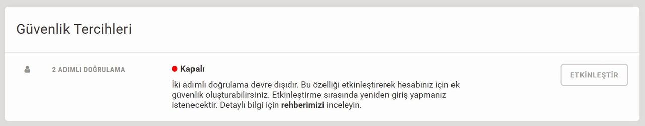 8- 2FA özelliği devre dışı bırakılır ve güvenlik tercihleri kısmında bu özellik “Etkinleştir” olarak görünür.