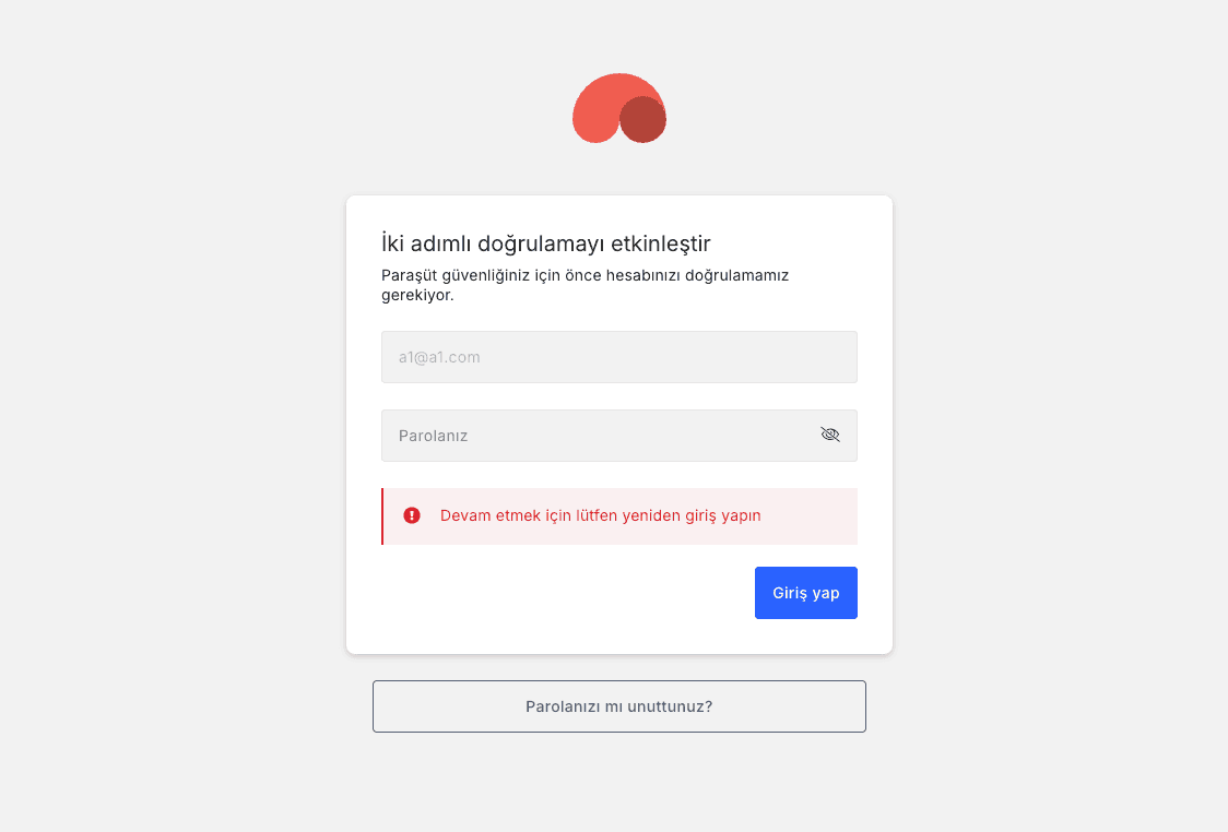 Paraşüt hesabınıza giriş yapmış olsanız da güvenliğiniz için ek bir doğrulama adımı gerekmektedir. Bu işlem sırasında hesabınızdan çıkış yapılmaz. Doğrulamayı sürdürmek istemezseniz sayfadan ayrılıp mevcut oturumunuzla kullanmaya devam edebilirsiniz.