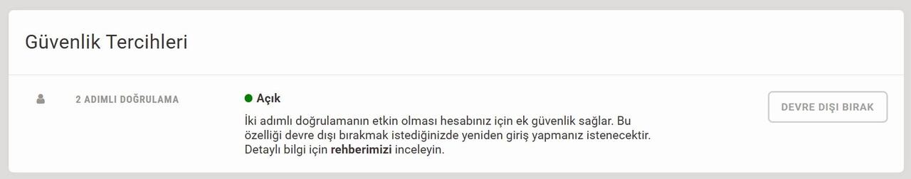 8- Kod doğru girildiğinde 2FA etkinleşir ve güvenlik tercihleri kısmında özellik “Devre Dışı Bırak” olarak görünür.