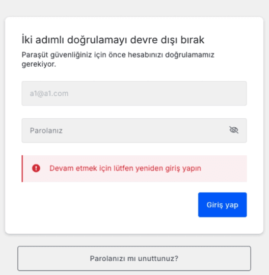 İki adımlı doğrulama devre dışı bırakıldıktan sonra, sonraki girişlerde OTP istenmeyecek; güncel e-posta ve parolanızla giriş yapmanız yeterli olacaktır.