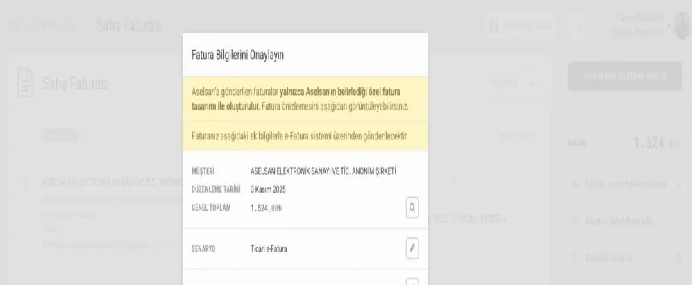 Aselsan'a göndermek istediğiniz faturalar, Aselsan'a ait 0860042250 vergi kimlik numarasından tanınacaktır. Eğer daha önce Aselsan'a sol menüde yer alan “Müşteriler” sayfanıza VKN bilgileriyle kaydetmişseniz, fatura oluşturma sayfasındaki “Müşteri” alanından müşteri olarak eklediğiniz Aselsan'ı seçerek işlemlerinize devam edebilirsiniz. Eğer daha önce Aselsan'ı müşteriniz olarak kaydetmemişseniz ya da Aselsan VKN bilgileri olmadan müşteriniz olarak kaydetmişseniz, faturayı gönderme aşamasında müşteri VKN bilgileri sizden istenecektir. Böylelikle, Aselsan VKN’si uygulama tarafından otomatik olarak tanıyacaktır.