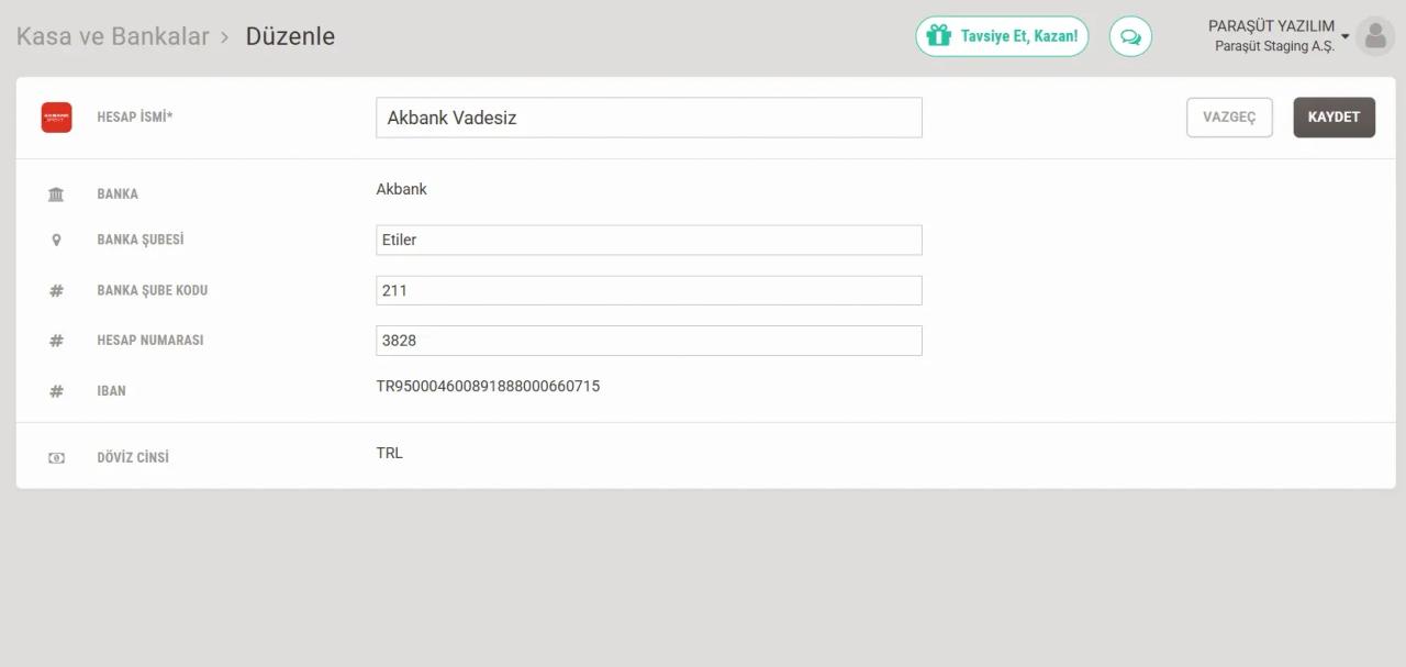 Ayrıca fatura görselinde IBAN bilgilerinin görüntülenebilmesi için 'IBAN Bilgisi Ekle' alanından, daha önce Paraşüt sistemine tanımlanmış IBAN bilgileri seçilebilir. Aselsan’a düzenlenen faturalarda ise en az bir banka bilgisinin bulunması zorunludur. Aselsan, şube kodu bilgisini de zorunlu tutmaktadır. Seçilen banka hesabına şube kodu bilgisi eklenmediyse, bu bilgi Kasa/Banka> İlgili Hesap>Düzenle alanında yer alan “Şube Kodu” kısmına girilmelidir.