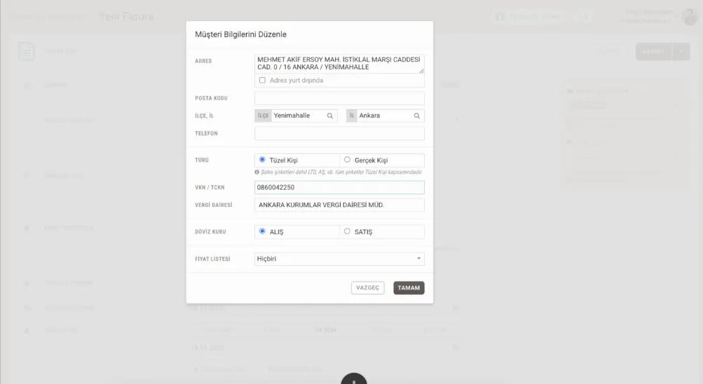 Tahsilat durumu, düzenleme tarihi ve vade tarihi seçebilirsiniz. Farklı bir döviz cinsi ile fatura oluşturmak istiyorsanız Döviz Değiştir kısmını kullanabilir ve mevcut olan dövizlerden birini seçebilirsiniz.