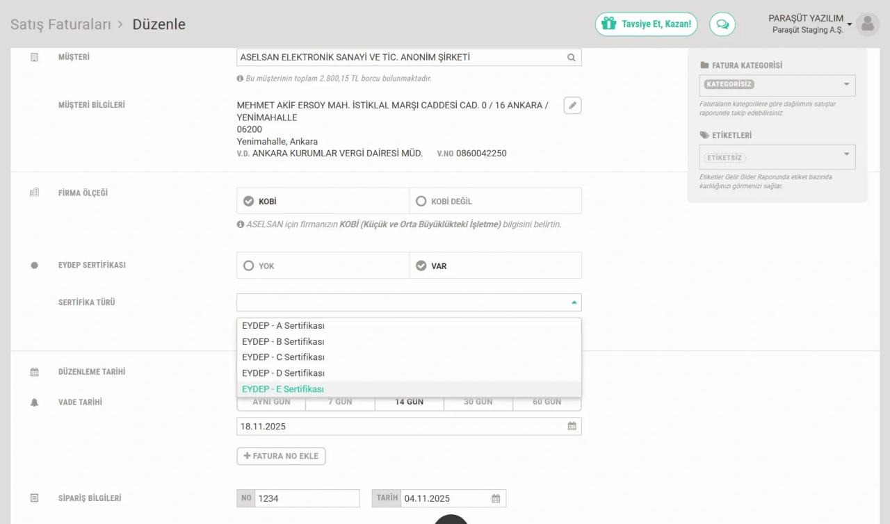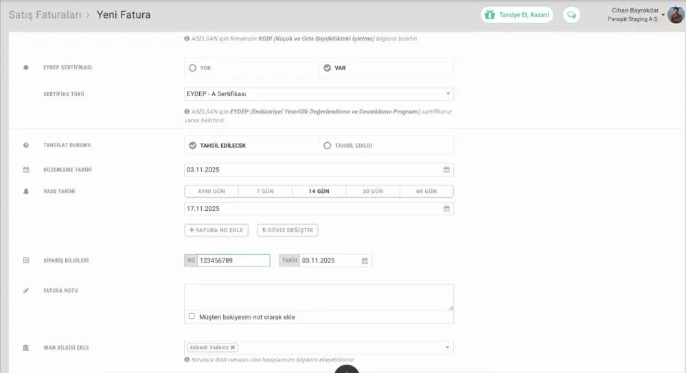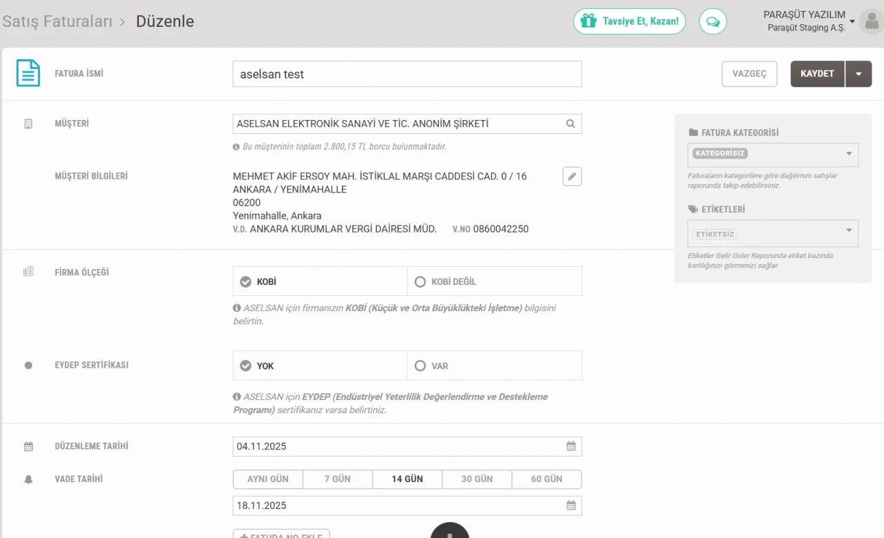 Paraşüt üzerinden Aselsan fatura oluşturma adımları