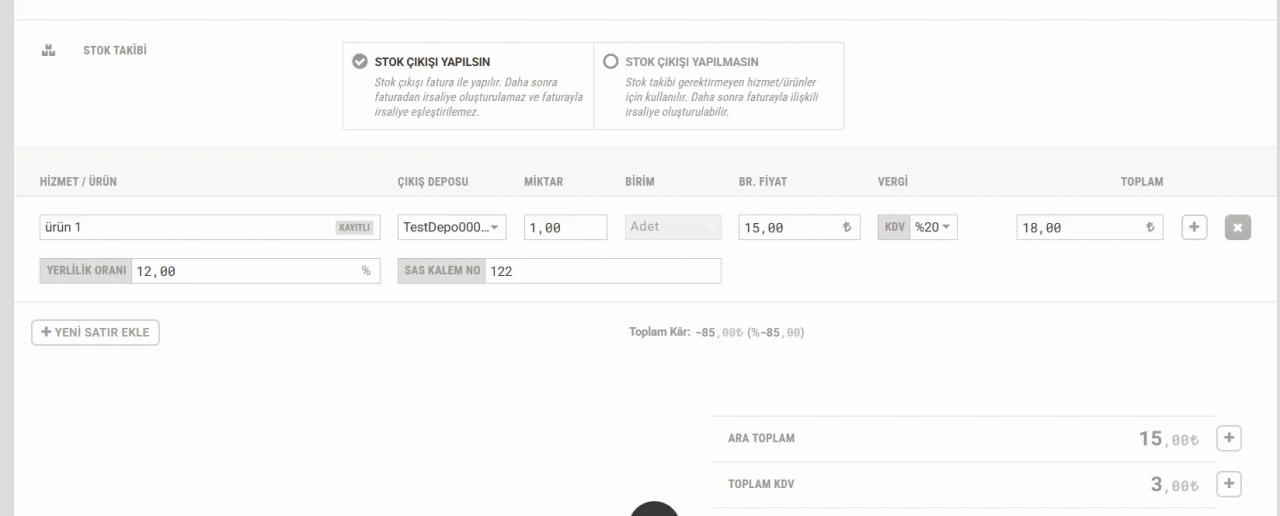 Sistemde stok takibi yapılıyorsa, "Stok çıkışı yapılsın" eğer stok takibi yapılmıyorsa, "Stok çıkışı yapılmasın" olarak seçilebilir.